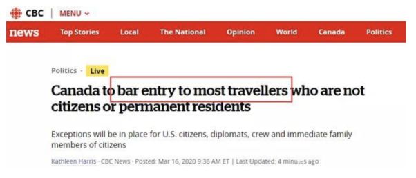 3月16日下午加拿大总理杜鲁多宣布禁止非公民或持有永居证者入境加拿大。